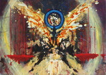 Combinatie van acryl inkt en verf. Het gouden effect is gecreëerd door gouden pigmentstof op de natte verf te blazen vanaf een paletmes. Geïnspireerd door het nummer "God made an Angel" van de band Timbuk 3 God made an angel, He liked what he saw